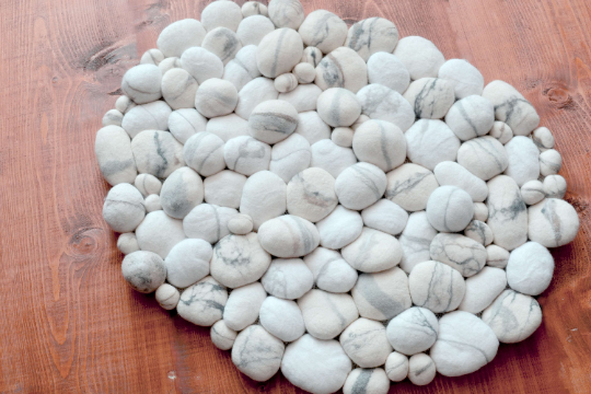 It looks like the smooth pebbles found around rivers! Actually this rug has been beautifully created from felt to make it look like a bed of stones which will feel soft and comfortable unlike the pebbles. It may look like it's constructed of real stones, but they are actually handmade by natural fibers (the finest merino wool). Though they may fool the eye, they provide immediately recognizable comfort.