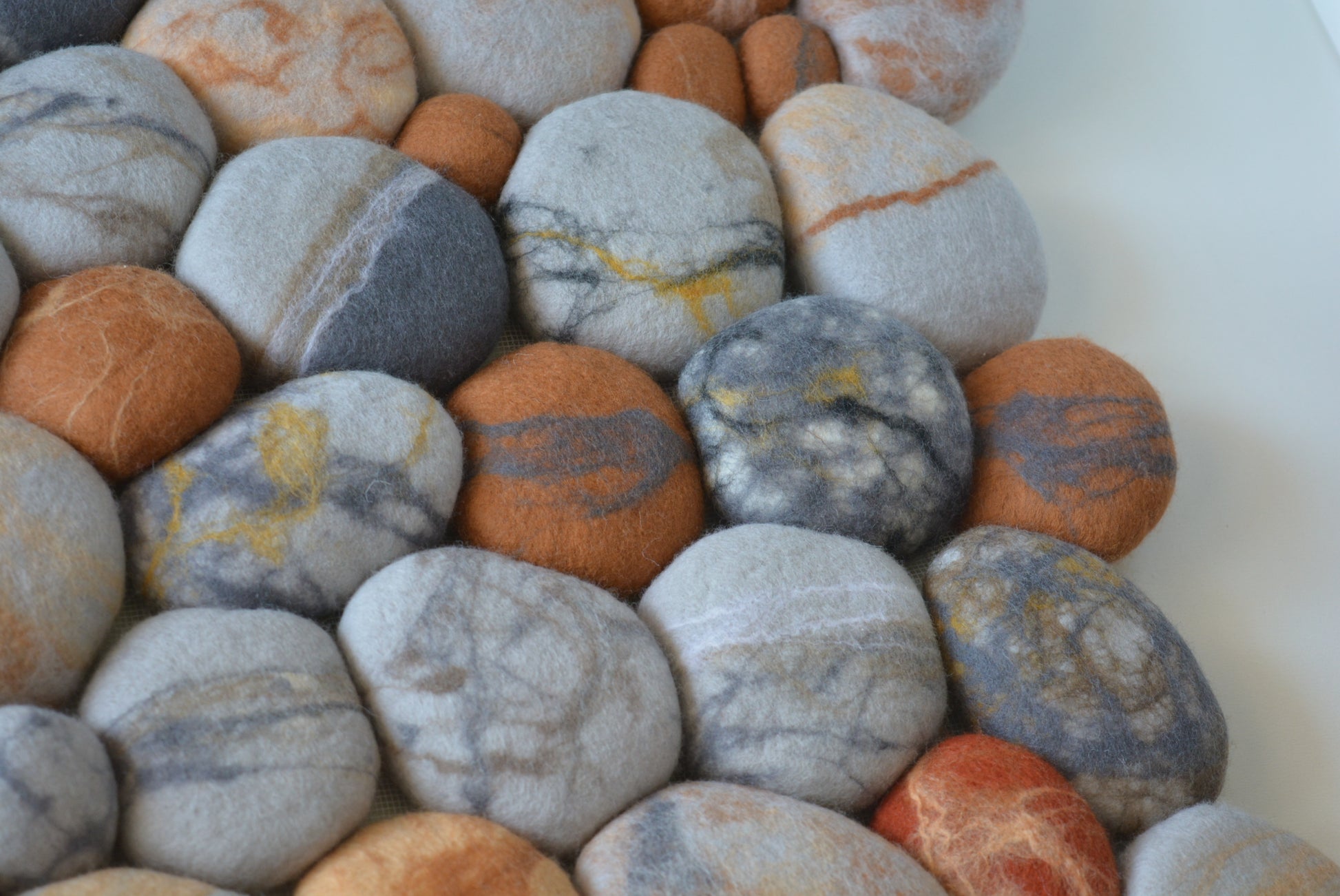 It looks like the smooth pebbles found around rivers! Actually this rug has been beautifully created from felt to make it look like a bed of stones which will feel soft and comfortable unlike the pebbles. It may look like it's constructed of real stones, but they are actually handmade by natural fibers (the finest merino wool). Though they may fool the eye, they provide immediately recognizable comfort.