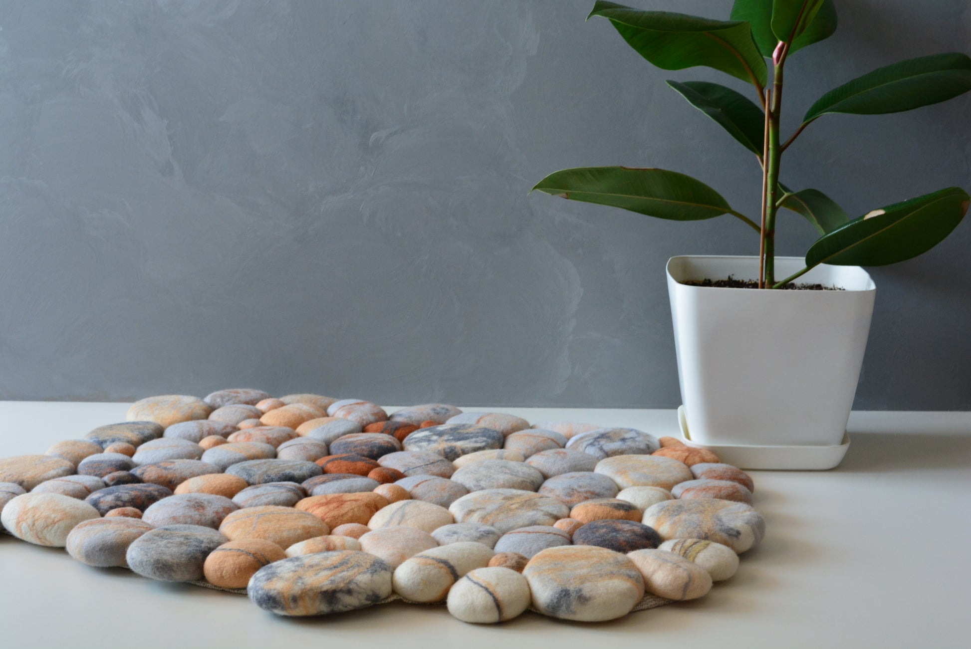It looks like the smooth pebbles found around rivers! Actually this rug has been beautifully created from felt to make it look like a bed of stones which will feel soft and comfortable unlike the pebbles. It may look like it's constructed of real stones, but they are actually handmade by natural fibers (the finest merino wool). Though they may fool the eye, they provide immediately recognizable comfort.