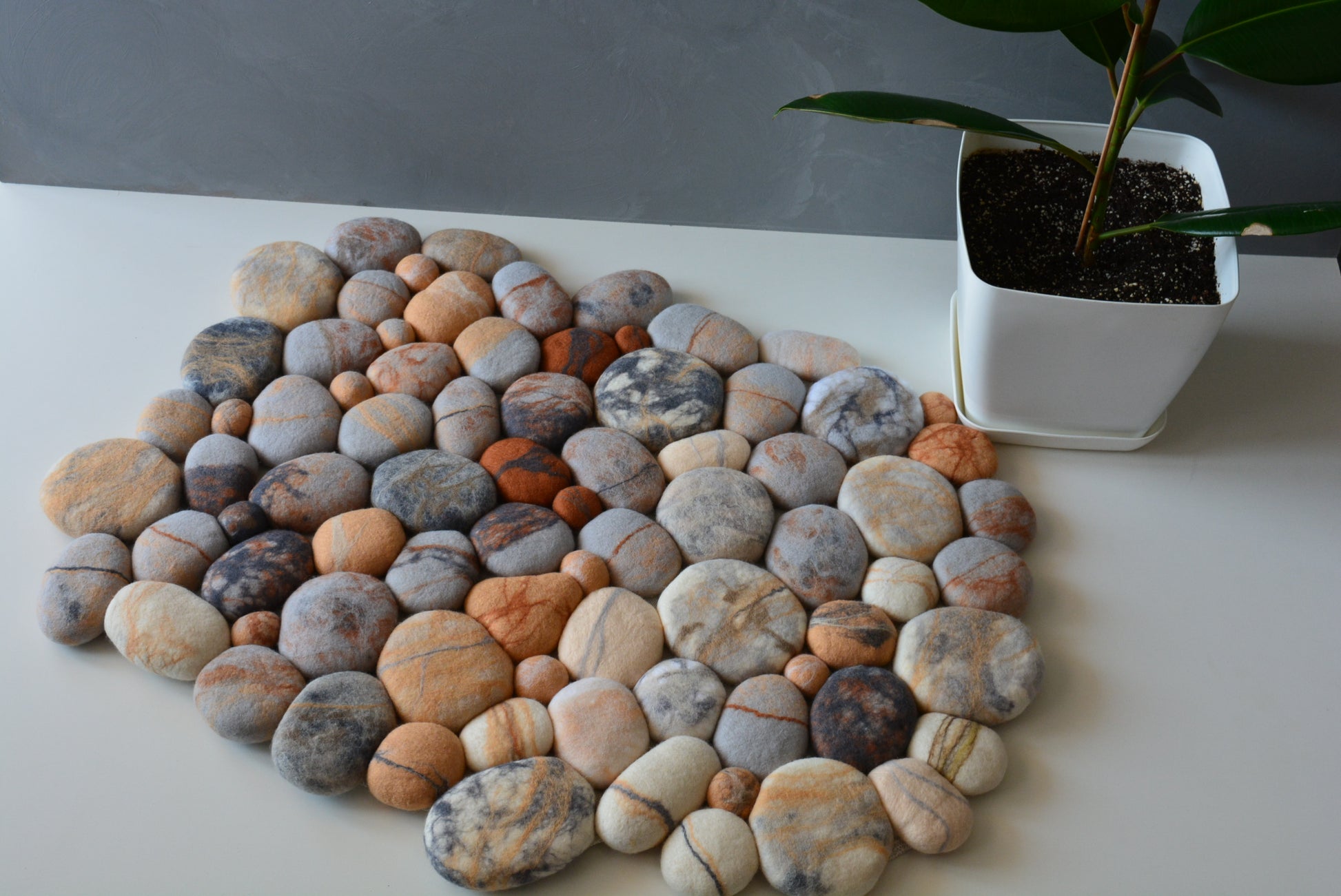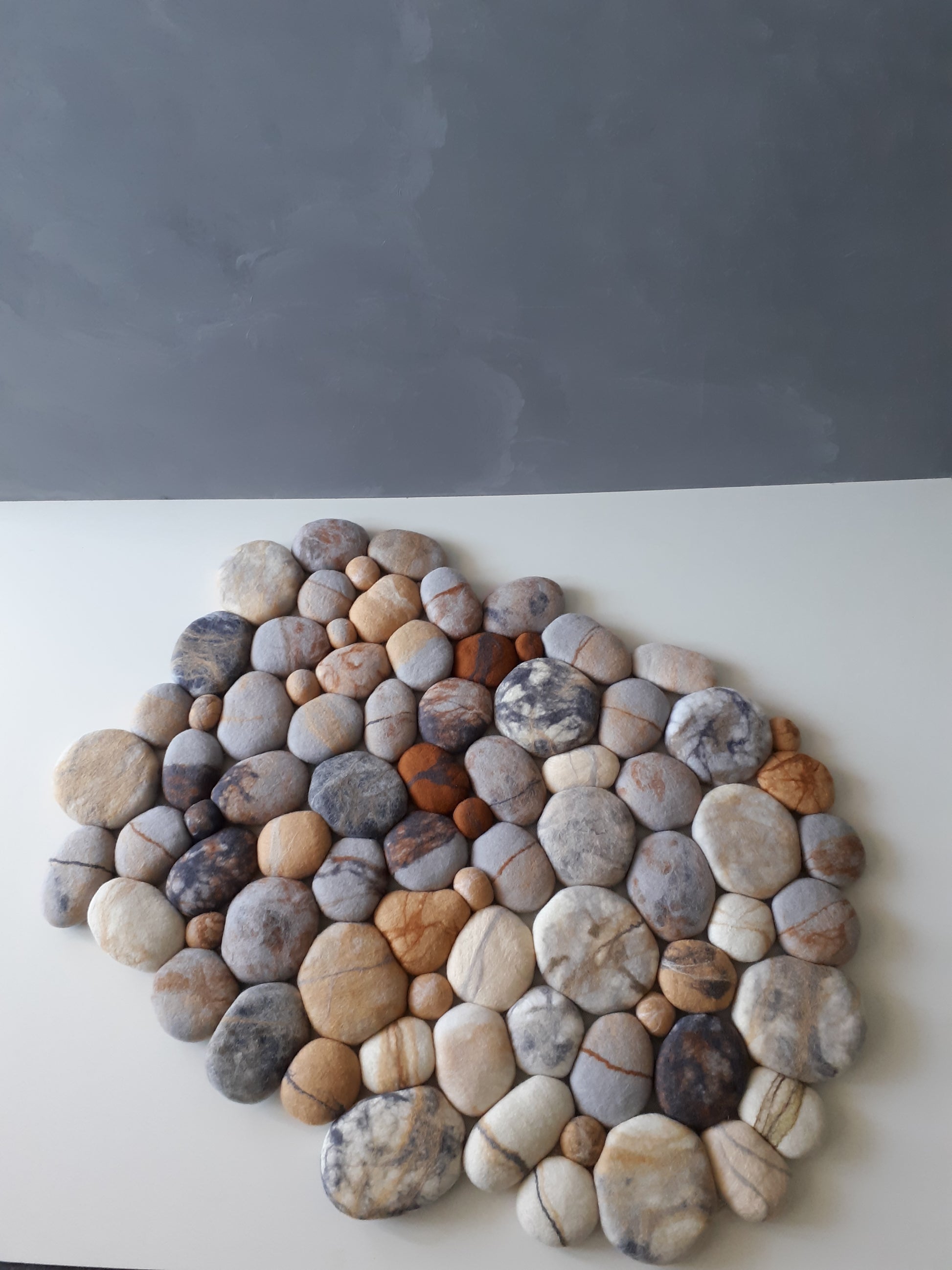 You can chose the shade of stones from our listings at the "felt stone rug" section in our shop, or you can send us picture of you interior, so we customize it to fix perfectly at the place you would prefer to use it. Or you can just send us any photo shot of stones taken in the nature, or finding in the web. We can create what you like the most.