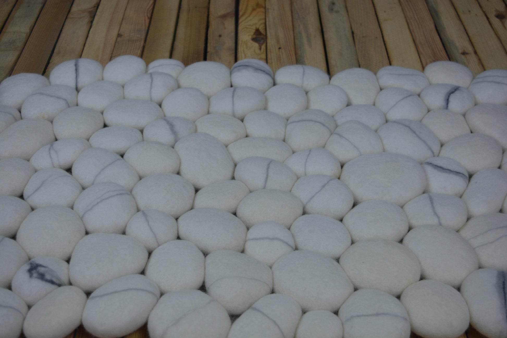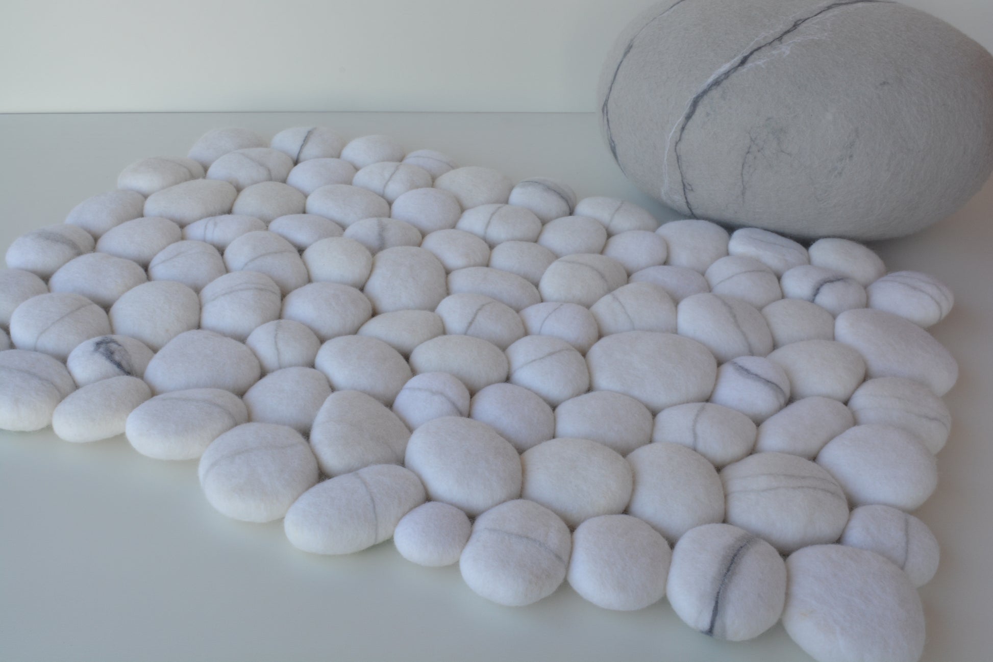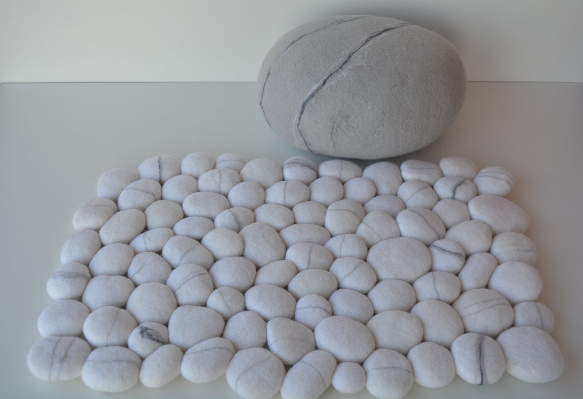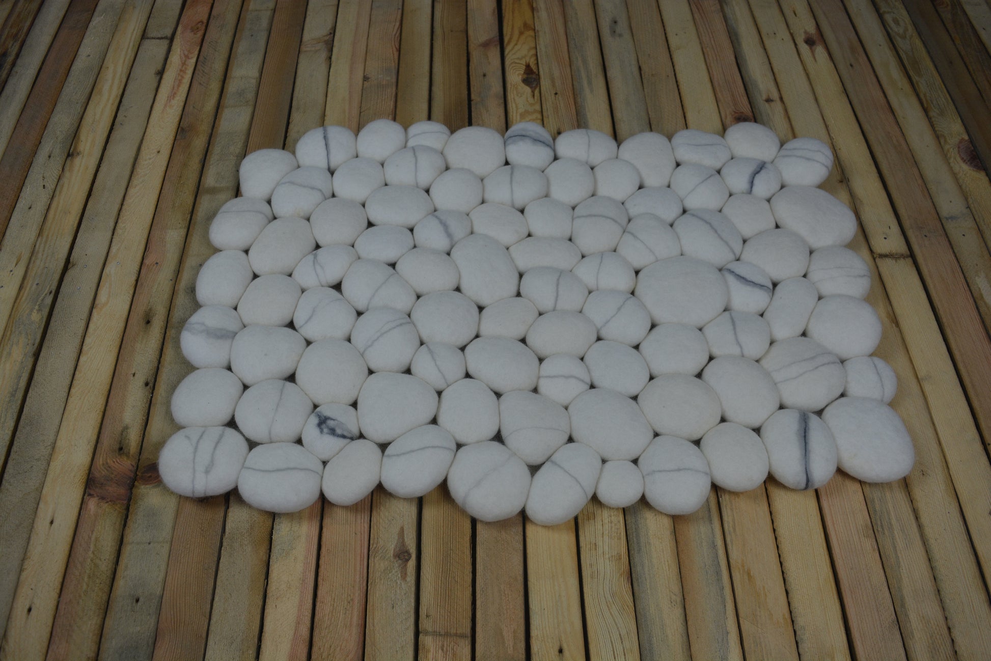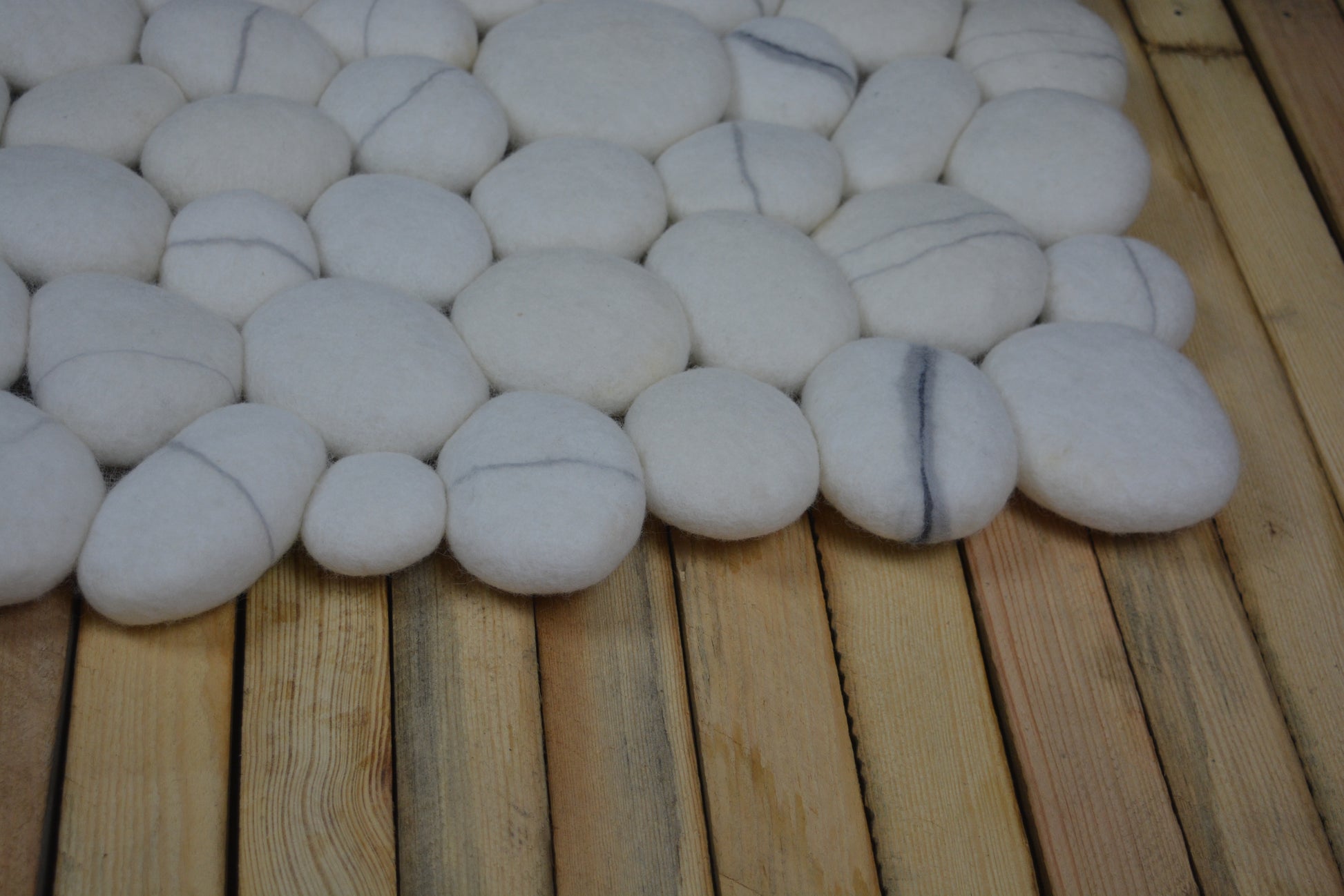 It looks like the smooth pebbles found around rivers! Actually this rug has been beautifully created from felt to make it look like a bed of stones which will feel soft and comfortable unlike the pebbles. It may look like it's constructed of real stones, but they are actually handmade by natural fibers (the finest merino wool). Though they may fool the eye, they provide immediately recognizable comfort.